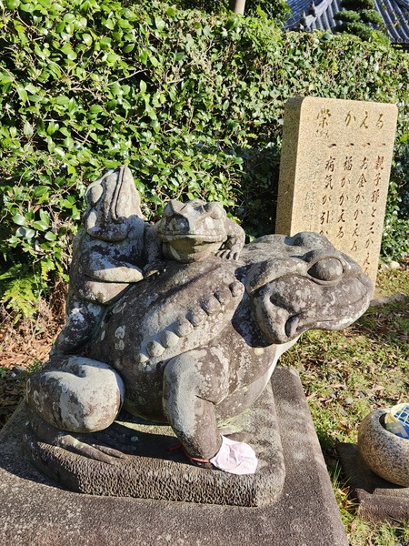 青蛙背小青蛙的親子蛙石雕.後刻有抱住一份福氣.疾病退散等吉祥寓意.