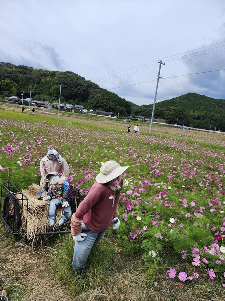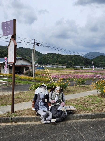 由第41番龍光寺.循31縣道的優閒鄉間道路.來到三間町的花卉農田.路旁怎坐著兩位農婦.細看是人偶啦!