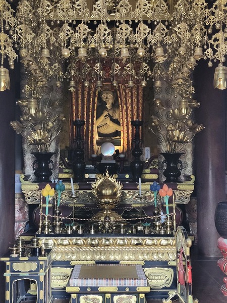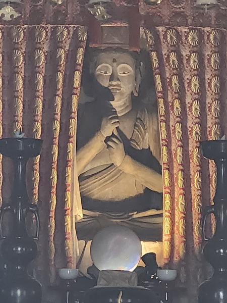 大日如來佛像.高1.2公尺.用木塊並拼湊鑲嵌而成.有鐮倉時期的墨書銘.是縣指定文化財.