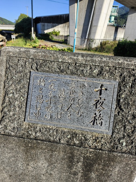 十夜橋之名.源於空海大師的這首詩.他在四國朝拜之路時.因飢餓和夜幕降臨時無處安身而寫下這首詩.意為過橋的馬車聲.腳步聲.絡繹不絕.讓大師感覺一夜就像十夜那麼長.因而這座橋現在就叫"十夜橋".後來的朝聖者過橋時不使用金剛杖的習俗源於此.不希望使用金剛杖的聲音吵醒大師.