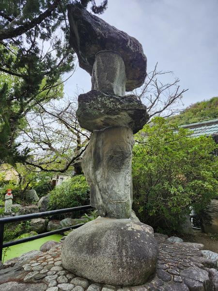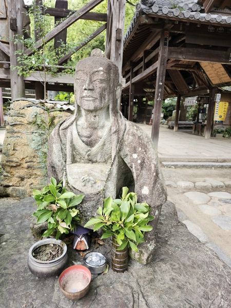 衛門三郎石像.石手寺的名字.源自於四國遍路巡禮創始人衛門三郎歸來的傳說.在某次朝聖過程中.衛門三郎生病了.他手裡握著一塊刻有[衛門三郎歸來]的石頭.死後做為轉世投生到河野家的證明.這塊石頭被供奉在這寺廟裡.寺廟的名字變成了[石手寺].
