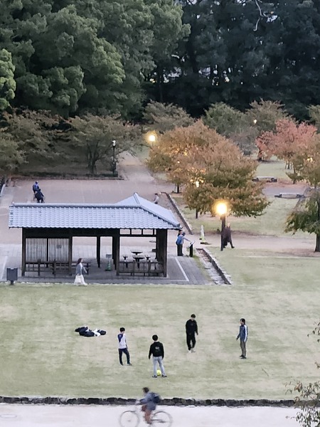 松山城下的公園廣場.許多運動的市民.