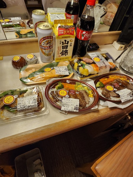 旅館房間.將剛才購買折價的熟食排開.琳瑯滿目.佐清酒.啤酒.可樂.非常快樂.尤其.折價的熟食.吃起來格外滿足.