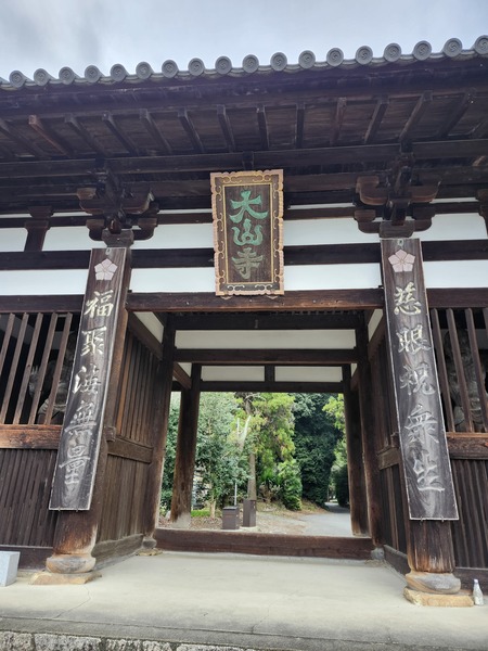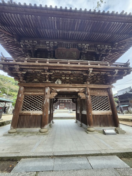 太山寺的山門.和本堂一樣.建於1305年.是寺院亮點.保留了鐮倉時代建築特色的八腳門.山牆屋頂為瓦片.門兩側內供俸金剛力士雕像.據說後來因為雷擊而變成單層的門.已被指定為國家重要文化財產.