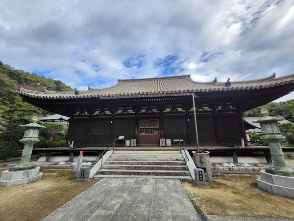 本堂建於1305年.由松山城主河野家出資重建.屋頂是歇山頂式建築.房屋大樑(房屋長度)約12公尺.樑跨(房屋寬度)約16公尺.氣勢雄偉.是愛媛縣最大的木造建築.已被指定為國寶.
