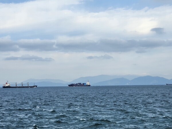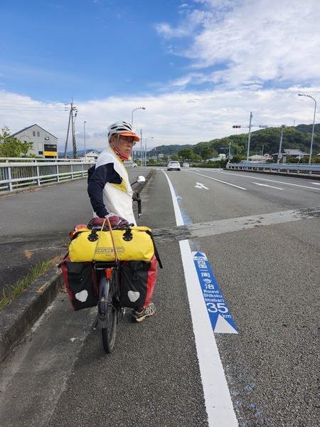 往今治的196國道.很多都是濱臨瀨戶內海騎行.內海中的輪船.對面是本州的山峰.