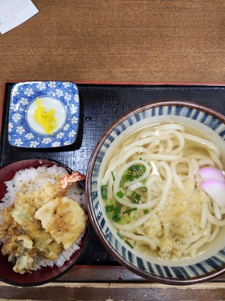 午餐在車站內的餐廳.吃烏龍麵+炸物飯的套餐.