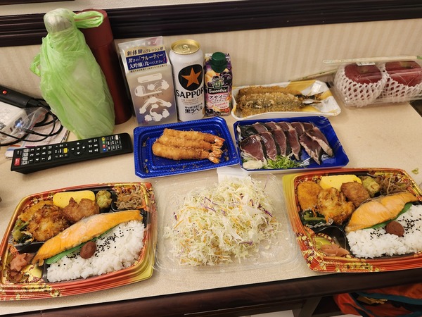 超市買豐盛晚餐回房間吃.有魚便當.炸魚.炸蝦.鰹魚.沙拉.還有啤酒及清酒.把昨晚及今天流失的養分.好好補回來.讚啦!