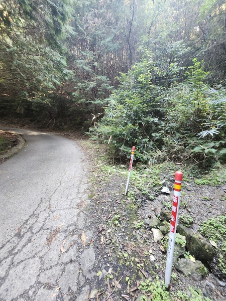 四國中央市.農路的[路肩注意]警示桿.重裝單車難騎上山.將裝備藏在路旁隱密處.輕裝騎上山.