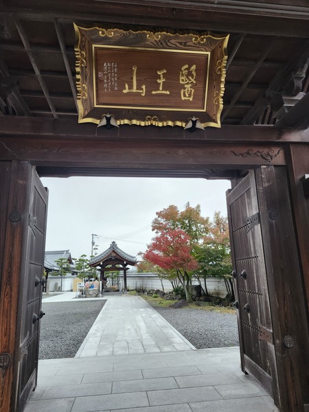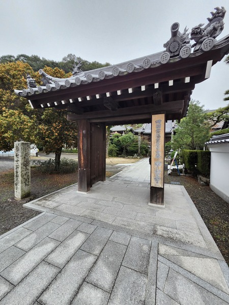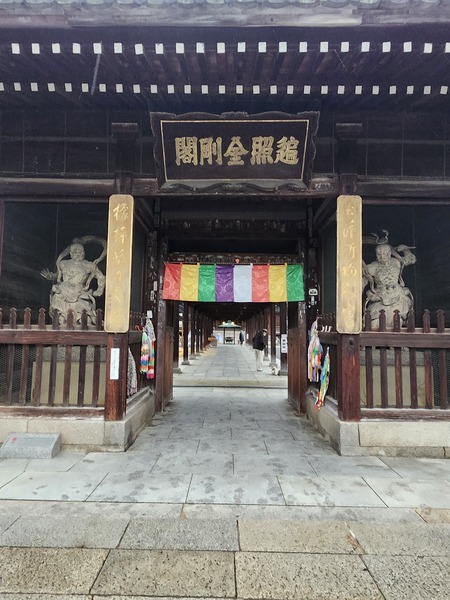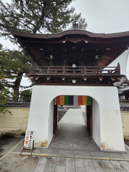 正覺門(山門).是善通寺西院入口正門.門上白色牆基與深色木質建築結構.形成鮮明對比.門上掛有[五色幕].