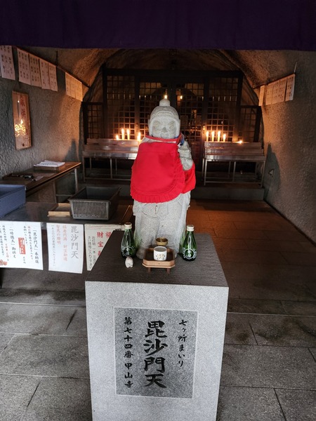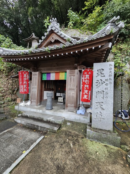 毘沙門天岩洞.為約深12公尺的岩洞.裡面供奉毘沙門天像.據說是弘法大師雕刻的.信徒可進岩洞內參拜.前方為毘沙門天石像.為七福神之一.