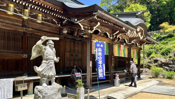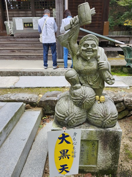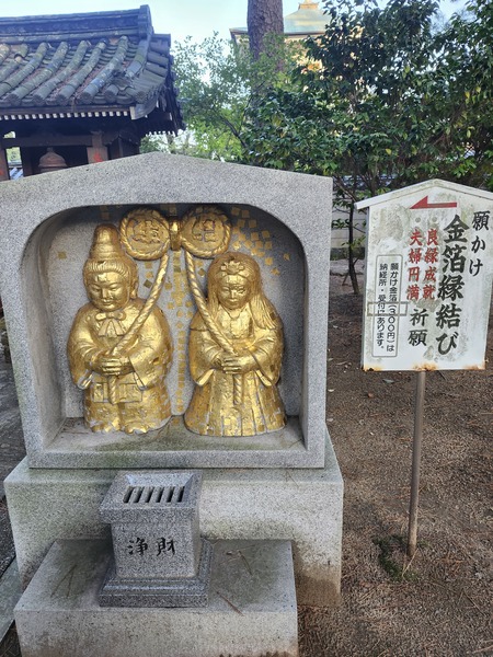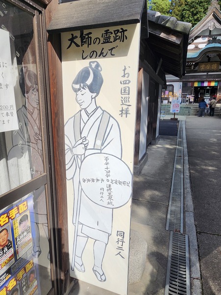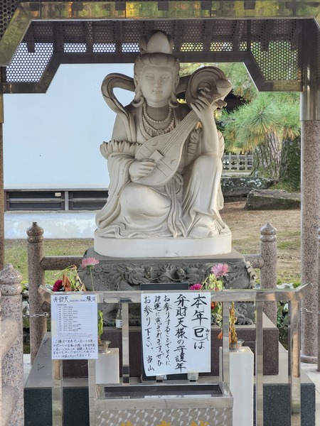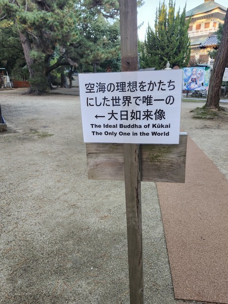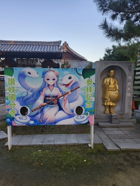 右邊是弘法大師金色塑像.左邊是紀念拍照看板.看板上的動漫角色形象.是寺廟供奉[弁才天]的擬人化.以及作為其使者的白蛇.