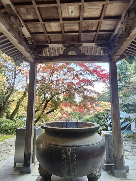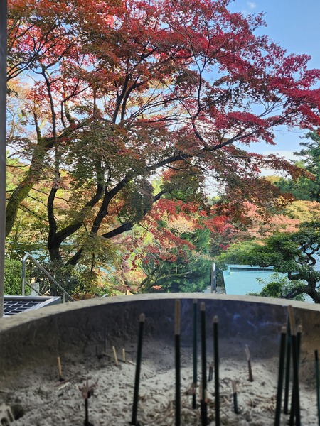 由大香爐的香煙中.看滿山的楓紅.很有詩意.