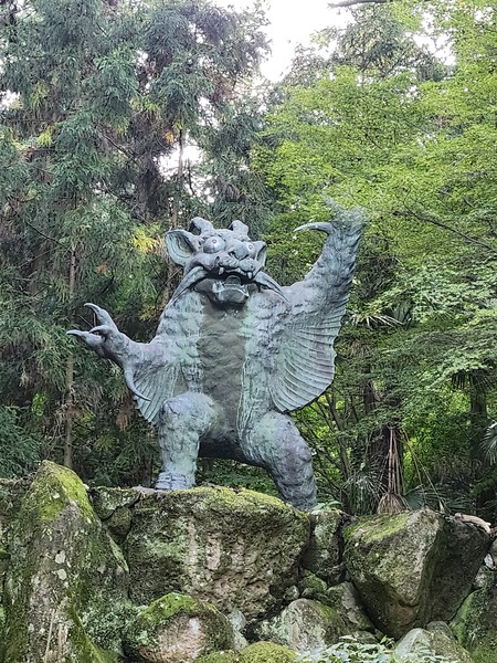 牛鬼像.臉上表情猙獰的矗立著.在寺院的停車場旁邊樹叢中.是寺院亮點.傳說.約400年前.青峰山有一隻吃人的牛妖.後來被神箭手射殺除害.神箭手將牛妖的角砍下來獻給根香寺.至今仍保存在寺院中.另外.避邪的牛鬼圖護身符也很受歡迎.