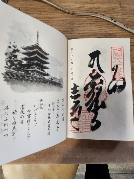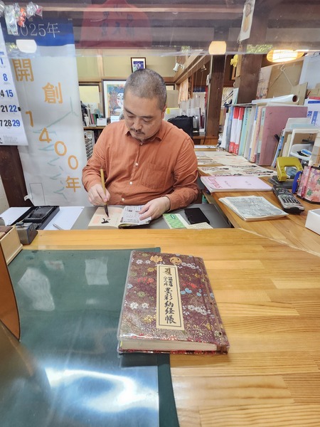 寺院副主持Sogo先生.正在納經帳揮毫.還送我一顆巧克力.