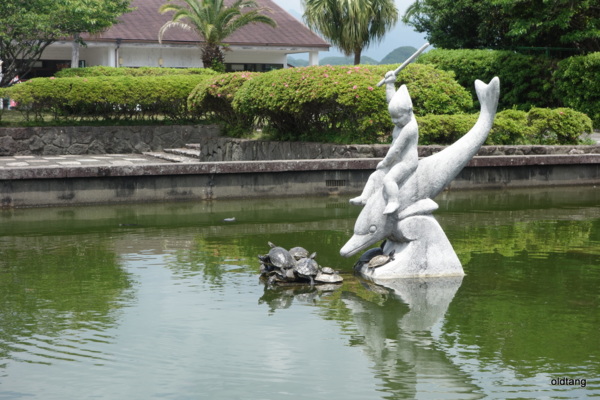 鯨魚博物館前水池.許多烏龜在海豚雕塑前曬太陽.