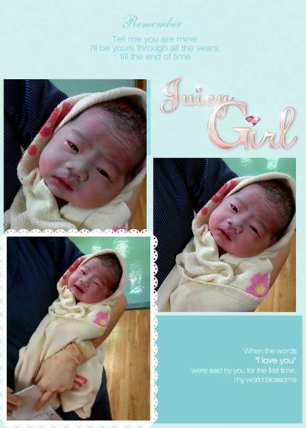當妳被送到我胸前讓我抱抱妳時,媽媽好感動,我本來以為我們母女第一次見面因為太感動會一起哭,但是沒想到妳一讓我抱到就不哭了,所以媽媽只好一直說"媽媽愛你喔’,我也看到醫生叔叔聽到正在微微笑。雖然因為妳有3630克,讓媽媽有三處撕裂傷,但是看到妳健康的生下來,媽媽真的好開心。
