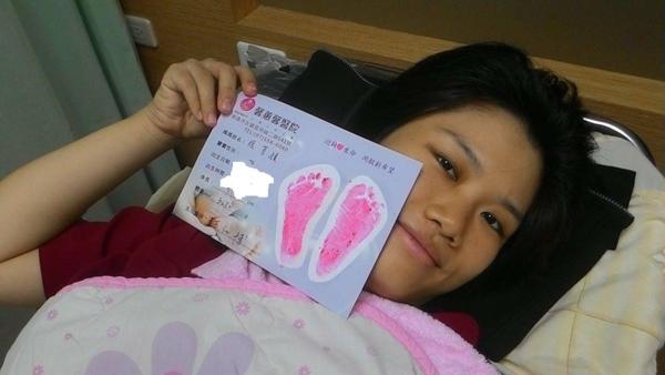 記得用力了幾次,最後是護士阿姨幫忙用手肘把妳推出來的,我感覺到有熱熱的東西被拉出來,然後是妳哇哇的哭聲。醫生接住妳的第一句話是"有點分量唷",媽媽一面讓醫生叔叔幫我縫合傷口,一面靜靜的看著妳被護士阿姨抱去清理,那時心裡想著"有哭,太好了,表示妳很健康"
