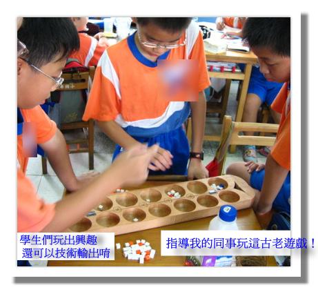 上彈性課程,我就敎學生玩,她/他們竟然玩出興趣了! 遊戲規則: 14個凹槽,每個凹槽各放七個,猜拳決定誰先走,從任何一個凹槽,取出槽內七顆棋仔(註),以逆時鐘方向往前在各槽各放一顆,最後放入的凹槽裡頭數為2或4者,即可取出。 後下者可選擇任何一個槽開始放,只要是方向相同即可。這個遊戲比誰最後拿的多就是勝者。 | |