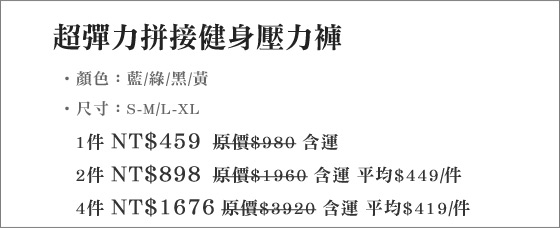 | 超彈力拼接健身壓力褲-彈力材質服貼身型,將美好曲線嶄露無遺!運動、健身單品搭配時尚拼接設計,讓動作看起來更加流暢有自信!平均每件最低只要419元起(含運)即可享有超彈力拼接健身壓力褲1件/2件/4件, 售價:419 我要購買 |