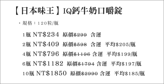 | 日本味王-IQ鈣牛奶口嚼錠-平均一瓶最低只要185元!特別添加微藻抽出物、鈣質、酪蛋白磷酸胜肽,天天營養補給,從裡到外健康不間斷平均每瓶最低只要185元起(含運)即可購得【日本味王】IQ鈣牛奶口嚼錠1 售價:185 我要購買 |