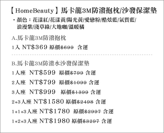 | HomeBeauty-馬卡龍3M防潑抱枕/馬卡龍3M防潑水沙發保潔墊-床墊穿了保潔墊,那沙發呢?100%台灣製造、通過合格認證,可機洗3M防潑透氣保潔墊,30秒快速安裝只要369元起(含運)即可購得【 售價:369 我要購買 |
