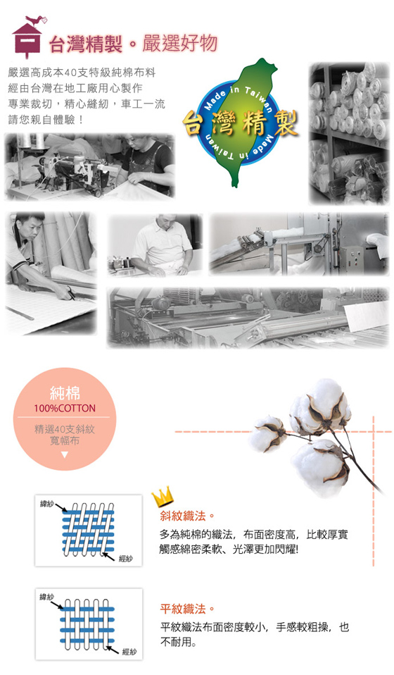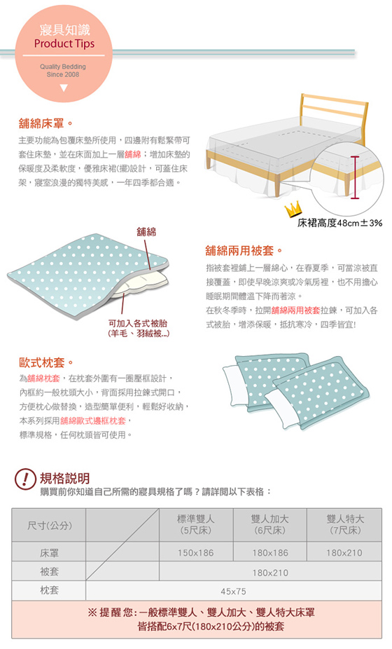 【織眠坊】台灣製特級純棉六件式床罩組,為您編織一場安詳夢境‧ 以最好的材料,做出最棒的產品! ![]() ![]() 商品說明 品名:【織眠坊】台灣製特級純棉六件式床罩組雙人 內容件數:鋪棉床罩x1+鋪棉兩用被套x1+鋪棉歐式枕套x2+糖果枕套x1+枕心x1,六件/組 材質:上表布/100%高級純棉 下表布/100%高級純棉 填充物/100%聚酯纖維 裡布/100%聚酯纖維 產地:台灣精製 尺寸:鋪棉兩用被套/6x7尺(180x210cm)±3% 鋪棉床罩/5x6.2尺(150x186cm)±3%,床裙高度48cm±3% 鋪棉歐式枕套/1.5x2.5尺(45x75cm)±3% 隱密式ㄇ字型床包收縮帶:有 被套內四角綁繩:有 品名:【織眠坊】台灣製特級純棉六件式床罩組雙人加大 內容件數:鋪棉床罩x1+鋪棉兩用被套x1+鋪棉歐式枕套x2+糖果枕套x1+枕心x1,六件/組 材質:上表布/100%高級純棉 下表布/100%高級純棉 填充物/100%聚酯纖維 裡布/100%聚酯纖維 產地:台灣精製 尺寸:鋪棉兩用被套/6x7尺(180x210cm)±3% 鋪棉床罩/6x6.2尺(180x186cm)±3%,床裙高度48cm±3% 鋪棉歐式枕套/1.5x2.5尺(45x75cm)±3% 隱密式ㄇ字型床包收縮帶:有 被套內四角綁繩:有 品名:【織眠坊】台灣製特級純棉六件式床罩組雙人特大 內容件數:鋪棉床罩x1+鋪棉兩用被套x1+鋪棉歐式枕套x2+糖果枕套x1+枕心x1,六件/組 材質:上表布/100%高級純棉 下表布/100%高級純棉 填充物/100%聚酯纖維 裡布/100%聚酯纖維 產地:台灣精製 尺寸:鋪棉兩用被套/6x7尺(180x210cm)±3% 鋪棉床罩/6x7尺(180x210cm)±3%,床裙高度48cm±3% 鋪棉歐式枕套/1.5x2.5尺(45x75cm)±3% 隱密式ㄇ字型床包收縮帶:有 被套內四角綁繩:有 清潔保養方式:可水洗/可乾洗/不可烘乾/不可漂白/熨燙溫度不可超過120度 注意事項:個人衛生用品,如經拆封使用、下水洗滌或拆解以致缺乏完整性及失去再販售價值時,恕不接受退換貨 ※商品圖檔顏色因電腦螢幕設定差異會略有不同,以實際商品顏色為準 ※商品為平放測量,可能會因某些因素產生些許誤差,誤差值在1~3公分上下為合理範圍 |