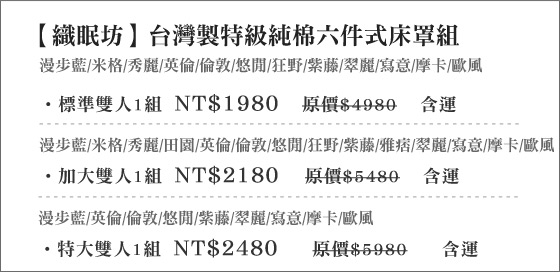 織眠坊-台灣製特級純棉六件式床罩組也有些網路上部落客的評價也值得我們參考.售價隨時會調整;特價有時效性,有需要的人動作要快!雅虎購物、momo購物及博客來是我比較常去逛的EC網購平台,常常有優惠商品可撿便宜。LYNN一向是個理性的消費者,能讓他讚賞的商品不多了!因為我自己也想要了解織眠坊-台灣製特級純棉六件式床罩組,所以到處尋找資訊做功課. |