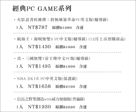 | 經典PC GAME系列-多款經典PC遊戲,精美場景、高畫質競賽與打鬥技術,想要成為電競高手,就從這些技巧開始培養起!只要787元起(含運)即可購得原價最高2290元經典PC GAME系列1入:(A)火 售價:787 我要購買 |