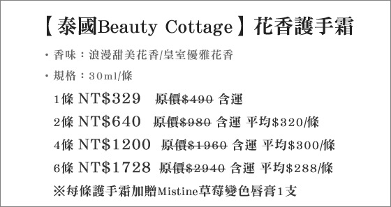 | 泰國Beauty Cottage-花香護手霜-泰國超夯Beauty Cottage花香護手霜.知名部落客強推!任選一款再贈變色唇膏,買多少送多少!平均每條最低只要288元起(含運)即可購得【泰國Bea 售價:288 我要購買 |