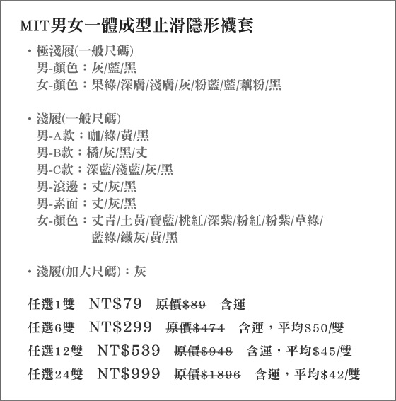 | MIT男女一體成型止滑隱形襪套-把襪子隱藏了!穿著舒適造型更完美!全棉材質,親膚X吸汗X透氣X止滑!不緊繃,穿久也不會悶熱不舒適!平均每雙最低只要42元起(含運)即可購得MIT男女一體成型止滑隱形襪套 售價:42 我要購買 |