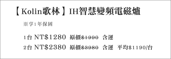 | Kolin歌林-IH智慧變頻電磁爐-俐落簡約的時尚烹調品味!智慧控溫更簡易,讓您輕鬆調整火力,煮出最佳的口味,在地老品牌製造,品質有保證平均每台最低只要1190元起(含運)即可購得【Kolin歌林】I 售價:1190 我要購買 |