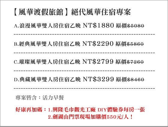 走進松林環繞的風華,微風輕拂 ![]() ![]() 以「極簡」、「禪風」為建築設計核心,融合中國風情與峇里意境,讓旅人找到心的釋放,停泊於這悠閒境界。 ![]() ![]() 大坪數寬敞空間,讓房間變成私人專屬的渡假城堡!Kize舒適床組,給您最良好的睡眠體驗。每間房型均打造不同風格浴室,設計感十足。優雅小花園,或是氣勢磅礡的水景瀑布,悠閒而慵懶的泡湯意境,忘卻世俗紛擾,在這裡全然屬於自我的時光,只感到愜意與美好。 浪漫風華雙人房 (A方案活動房型) 經典風華雙人房 (B方案活動房型) ![]() 璀璨風華雙人房 (C方案活動房型) ![]() 典藏風華雙人房 (D方案活動房型) ![]() 房型設備 獨立車庫、42吋電漿電視、浴室內置液晶電視、溫泉式按摩浴池、SPA 花灑系統、採用德國進口品牌VILLEROY & BOCH 高級洗臉盆、採用德國進口品牌 GROHE 懸壁式馬桶、南國峇里風情藝品、中國禪風藝品、手工編織品、私人園藝景觀區 ![]() 好康再加碼: 1.贈興隆毛巾觀光工廠DIY體驗券一張/房 2.劍湖山門票現場加購價550元/人 身為台灣第一家毛巾觀光工廠,成立近三十年,涵蓋多個年代的新舊毛巾織機,毛巾的製程豐富且獨具產業特色,加上自行研發的蛋糕毛巾,廣獲好評,提供了一個寓教於樂的休閒場域。 ![]() ![]() 作完你的DIY商品後,還可以到禮品部逛逛,帶個超有特色的毛巾伴手禮,兼具實用與美觀,送禮自用兩相宜喔! ![]() ![]() 憑此證可享:劍湖山門票現場加購價只要550元/人 專案皆附劍湖山世界門票,數十項遊樂設施,等你來玩透透! 享譽國際的台灣本土遊樂園-劍湖山世界,擁有60多公頃寬敞面積,並結合休閒、遊樂,成一多重功能的遊樂園區,就讓我們來看看劍湖山世界有什麼好玩的吧! ![]() ●●●●● 遊樂設施介紹 ●●●●●第一間與瑞士科技公司合作,依照樂園地形打造各種頂尖遊樂設施,包含摩天輪、雲霄飛車等,讓大人小孩在此度過歡樂時光。更搶先取得「北海小英雄All rights授權」打造主題「小威海盜村」,不斷求新求變,永遠也玩不膩! ![]() 小威海盜村 可愛的小威要與你分享一場充滿冒險的航海故事,不論在旅程中遇到了多少困難與挫折,小威運用他的機智總能化險為夷,幫助大家渡過難關,一起邁向未知的海上探險旅程! ![]() 彩虹摩天輪 高達88米約30樓層高,放眼望去,盡享360度美景!欣賞全園景致,並遠眺大尖山峰一脈相連、層巒疊翠的景觀,與雲握手、與風對話,嘉南平原風采盡收眼底。 ![]() 擎天飛梭 來自美國65米雙座高塔,「一飛沖天」以80km時速急升至65公尺的高空,挑戰加倍大氣壓力,直衝天際!「極速落體」從65公尺的高空以65km時速遽降,體驗高空失重,強力墜落的感受! ![]() 衝瘋飛車 首度引進360度大迴轉「無底盤式」雲霄飛車,軌道全長820公尺,高度40公尺。以時速90公里瘋狂俯衝,挑戰你的極限勇氣,顛覆你的全面感官,連續驚聲尖叫120秒,體驗超乎想像的High人動感! |