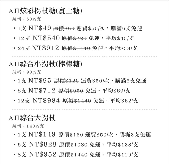 ☃一根拐杖糖,分享出更多快樂❅ ![]() ![]() 大人小孩都愛的拐杖糖 傳說一位很會做糖果的老人,某一天靈光乍現發明的,象徵是古代牧羊人的枴杖,引導小羊們知道要去哪裡,有豐富的草和乾淨的水源;希望把滿滿的祝福送給每個小朋友們。 ![]() 不同尺寸的枴杖,裏頭裝著繽紛可口的糖果們,讓人心情愉悅、超級嘴饞。 ![]() ✮AJI炫彩拐杖糖(賓士糖) 經典的賓士糖,一顆顆放入透明拐杖,多種顏色蘊含不同水果滋味,帶點復古懷舊的古早味零食。 ![]() ✮AJI綜合小拐杖(棒棒糖) 小朋友最愛的棒棒糖,多種口味從開口倒出來,口味多多、讓人難以抉擇。 ![]() ![]() ✮AJI綜合大拐杖 各種糖果驚喜、卡哇伊小物也一起躲在拐杖裡,打開來都是驚喜的微笑,和朋友一起分享更開心! ![]() ![]() 系列:AJI拐杖糖系列 品名:AJI炫彩拐杖糖(賓士糖) 規格:60g/支 品名:AJI綜合小拐杖(棒棒糖) 規格:90g/支 品名:AJI綜合大拐杖 規格:140g/支 ※因製作/包裝過程繁複,實品規格可能會有些許誤差 ※爲保持產品最佳風味,開封後請盡速食用完畢 |