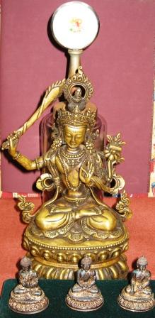 以佛陀舍利子於後、文殊師利菩薩在中、禪淨密三尊小佛像在前,