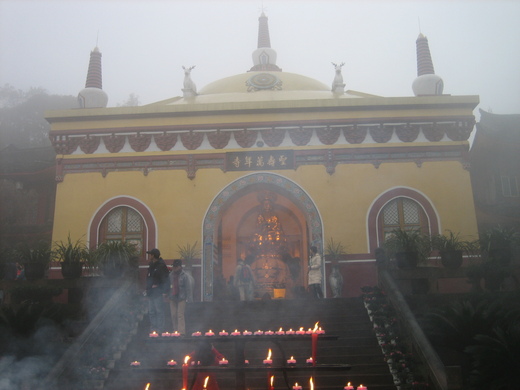 我們原也慕名想上峨嵋山那"如臨九天"的金頂的,可旅行社說現在的季節,山上的寺院多關門避冬了,這樣的天氣也很難看到"佛光","日出","雲海"和"聖燈"這"四大奇觀"。同團的一對香港夫婦,卻硬是穿上如往南極探險的衣裝,從接引殿直接上了金頂。