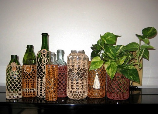 於是,讓空的果醬玻璃罐“改行”作養觀賞植物的容器;空的綠色紅酒樽本來就體態優美,作擺設感覺很溫馨;喝完的咖啡瓶可以用來裝小零食和糖... ...我還給它們穿上了鉤針織成的衣裳。