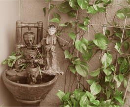 客廳桌上有一盆綠意盎然的攀藤“萬年青”,原是從室外那盆母枝上採擷移種過來的。短短﹑無根的枝條,翠綠的葉片中帶著點點白色的憂傷。雖無沃土,只以一瓮清水供養著,想不到,才一年的工夫,它竟枝繁葉茂,連原先枝藤上齊整的切口,也衍生出縷縷交錯的細根來。我已從這盆長成的繁枝上再分離另養了新枝,它們也都長得油油綠綠。
