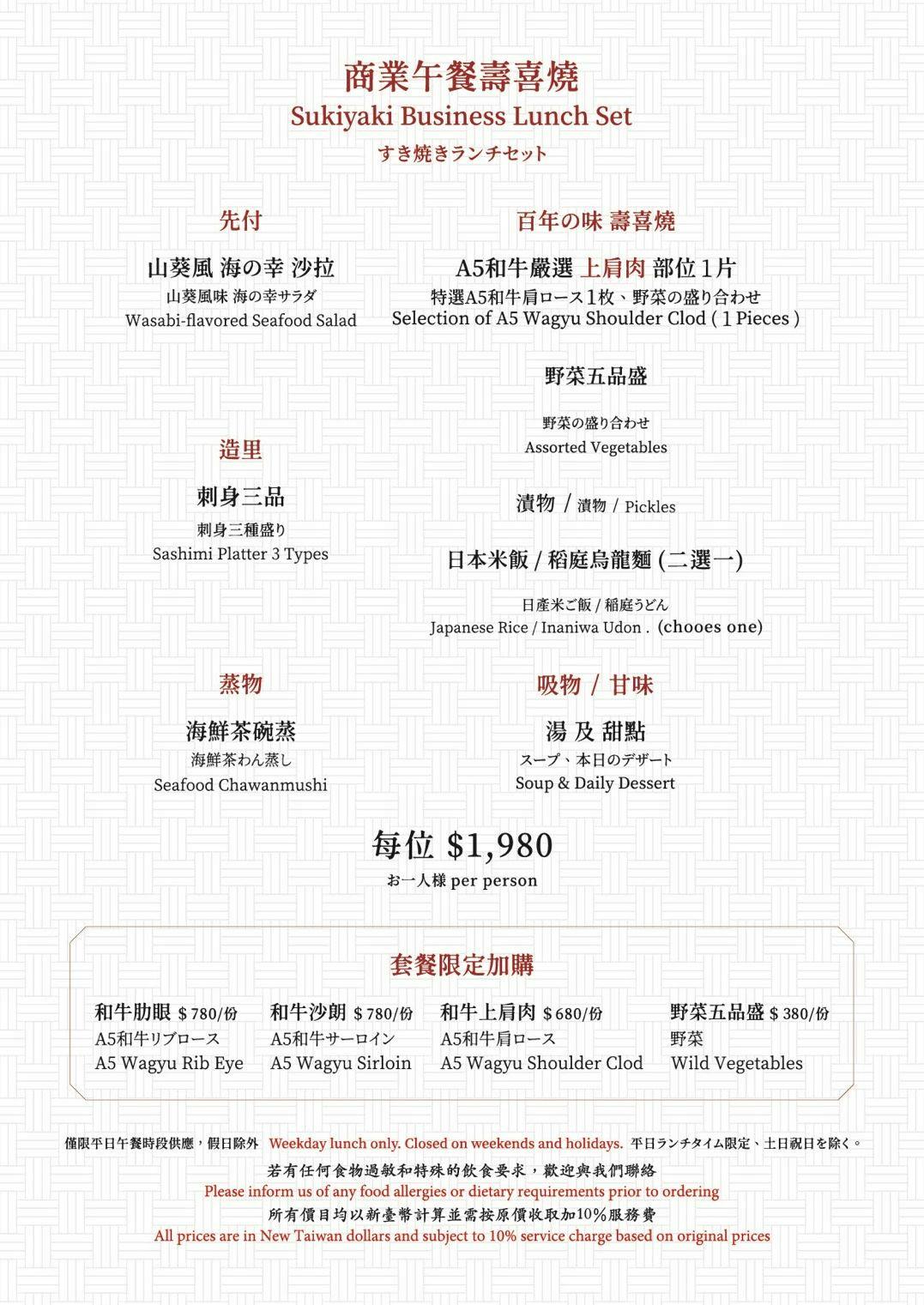 平日午餐時段供應每位1980元的午間商業壽喜燒套餐。