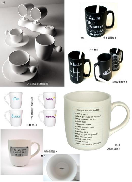 耶,我沒發現圖片的杯11和杯12與文字的連結搞反了耶!總之,就是情侶杯嘛!以為字連結的杯11來說,比較適合小孩送父母的禮物,不過小孩沒這麼多$吧?!:口