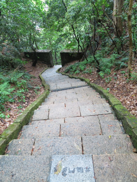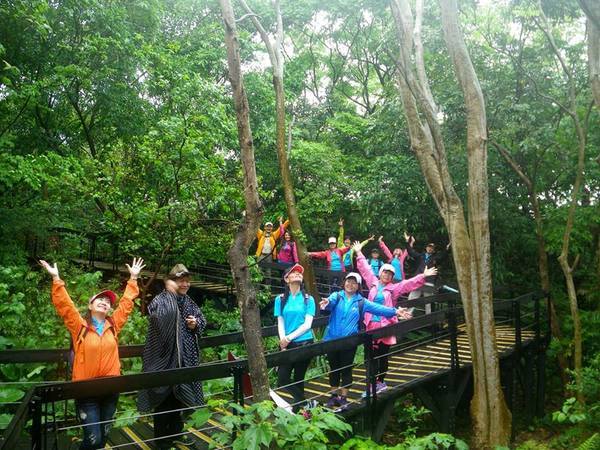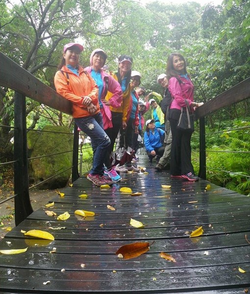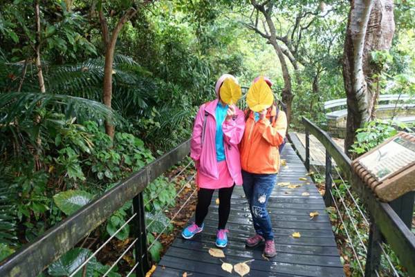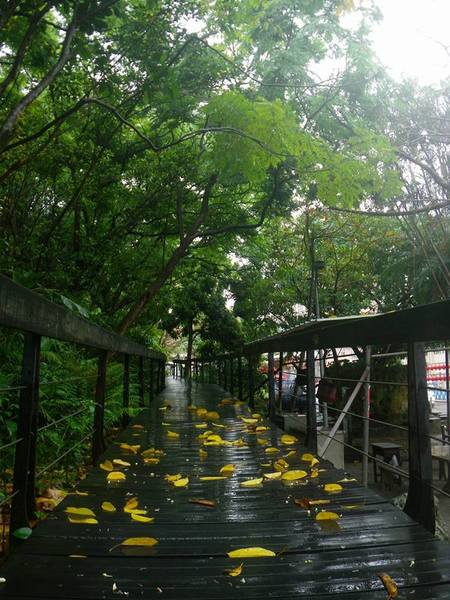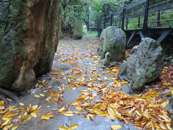 步道兩旁為木欄,環山而上,坡度平緩,林木成蔭,生態豐富,行走其間,舒適愜意。濕潤空氣中的微風輕佛,樹葉從樹上緩緩飄飄落,喜歡一葉葉的落葉落在步道上景象,彌漫雨天的氣息!!