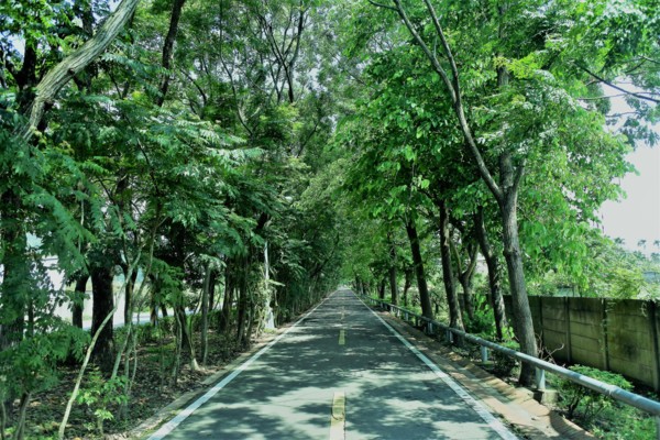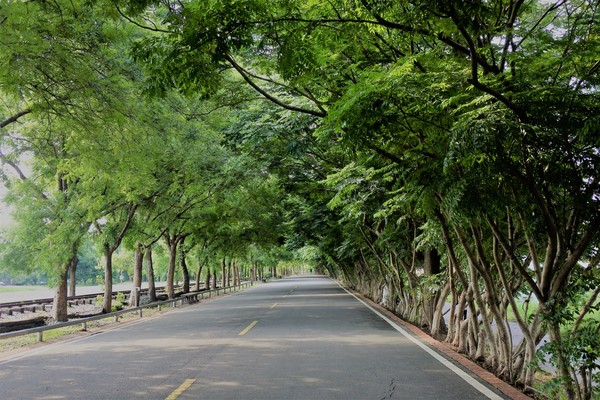 大樹矗立在車道的兩旁,形成涼爽的綠蔭大道。林蔭遮日,陽光照射下,樹蔭光影交錯顯得相當迷人