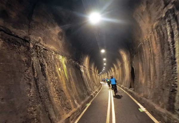 即來到另一座百年古跡,亦是全台最長的九號山線隧道,共約 1.28 公里,騎乘至此猶如進入時光隧道,讓人不禁想像著早期蒸氣火車穿越隧道的光景~~ 日治時期總督提字已模糊不清~「氣象雄深」、「潛行不窒」,說明隧道的特色與歷史意義。