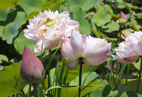 頂著正中午的太陽,來欣賞一下吧!!牡丹蓮隨風搖逸生姿,風采綽約的景象,盛開的花瓣以微卷, 顯得有一些意興闌珊了,有的還是花苞,緊緊地合在一起。
