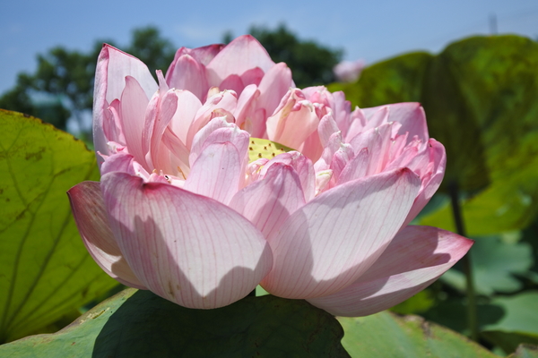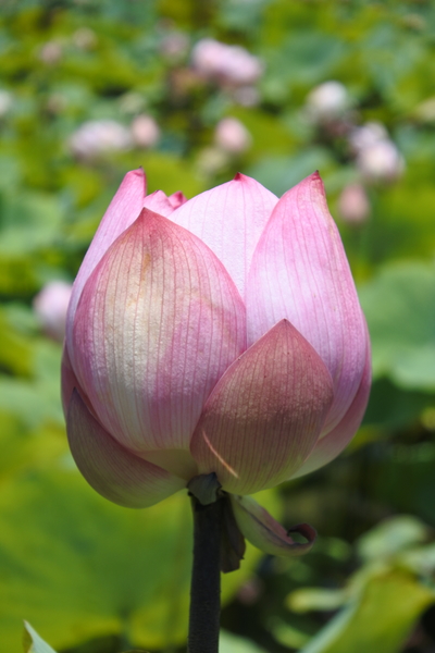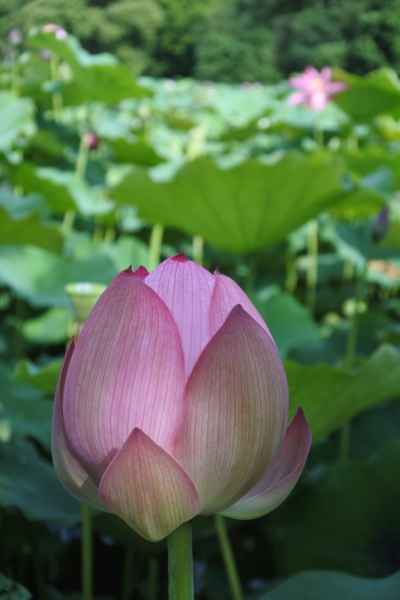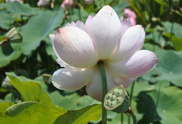 地主再為我們指引,沿著產業道路兩側農地行走,仍有幾處荷花田~~沒有賞荷的人潮,花期已接近尾聲了,還有不少荷花在風中搖曳,欣賞夏荷、綠藕、青荷葉之漫妙,粉紅色花瓣穿插於綠色荷葉間,大大的荷花,迎驕陽而不懼,出淤泥而不染,給人清淨高雅之感。雖然有的略微捲縮的花瓣,也透露出陽光的炙熱。