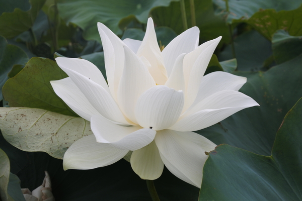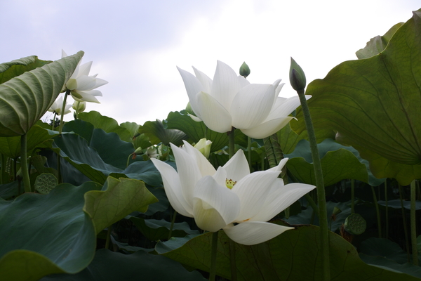 多美的白荷花啊!碧綠的荷葉把池塘擠得滿滿的。競相開放,全開的、半開的、姿態各異,爭奇鬥豔。有的綻開的花朵躲在一片荷葉後面。在荷葉的襯托下,荷花婷婷玉立,千姿百態,含笑佇立,嬌羞欲語;嫩蕊凝珠,盈盈欲滴,清香陣陣,沁人心脾!
