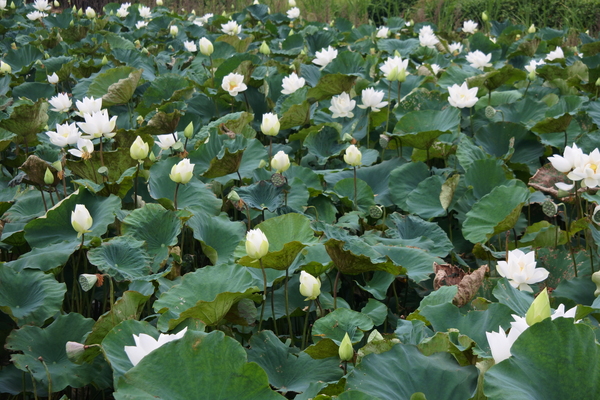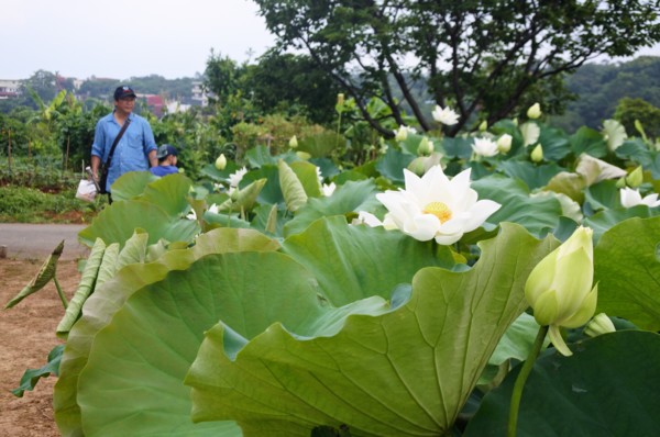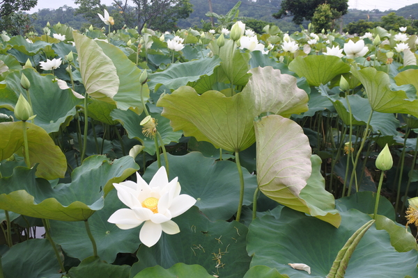 秘境,密境~穿梭在淡金公路北新莊山間小路小巷迴繞,一畝農田豁然出現,田裡綠意盎然大片大片怒放著朵朵的“白荷”綻放迎人,古詩裡「蓮葉荷田田」,近在呎尺的畦畦田塘裡,在烈日驕陽下,綠葉高舉,花開滿畦,純白無瑕,潔淨自然,或含苞或盛開。。