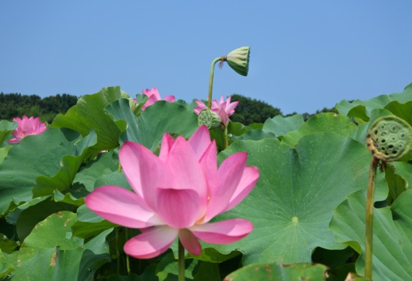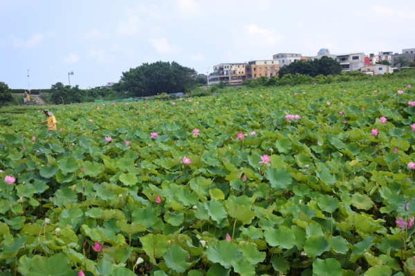 沿著產業道路兩側農地行走,有幾處荷花田,雖然花期已接近尾聲了,還有不少荷花在風中搖曳,欣賞夏荷、綠藕、青荷葉之漫妙,粉紅色花瓣穿插於綠色荷葉間,大大的荷花,迎驕陽而不懼,出淤泥而不染,給人清淨高雅之感。雖然有的略微捲縮的花瓣,也透露出陽光的炙熱。