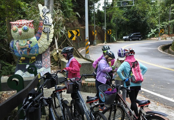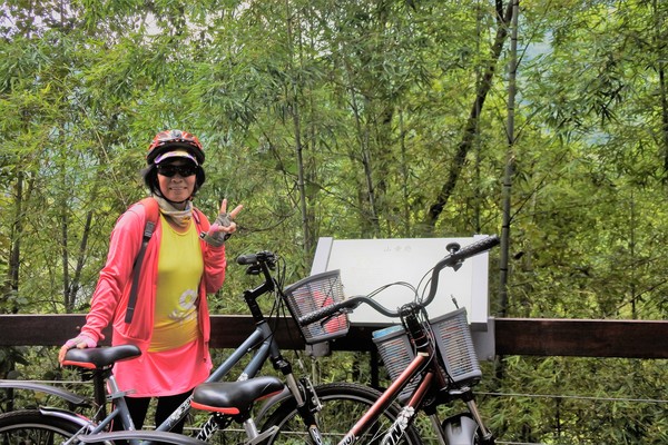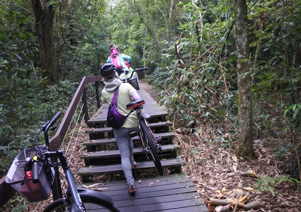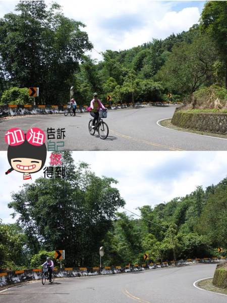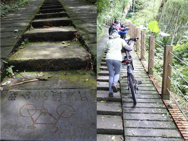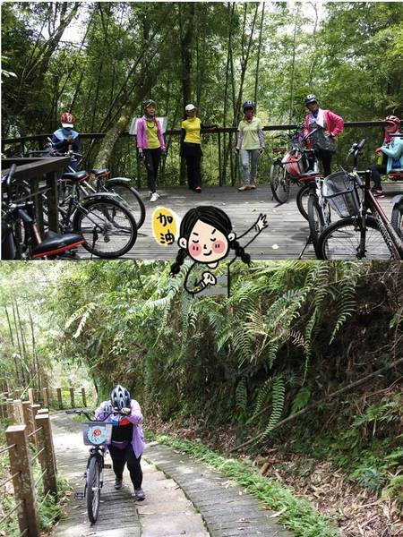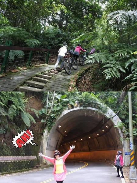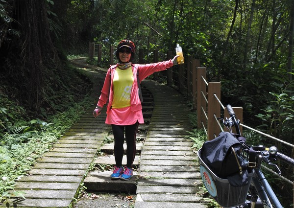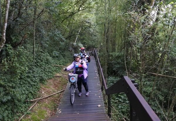 這短短80公尺的木棧道階梯考驗我們的體力與臂力,大嬸扛"鐵馬"發揮潛能~~展現無比的耐力~~終於到達環潭公路了!