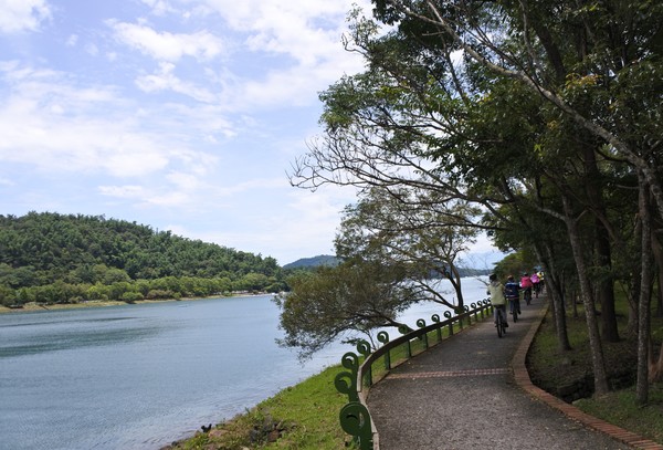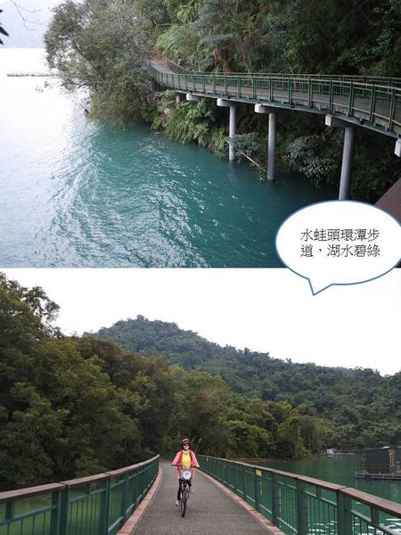 繼續往頭社自行車道前進,整條步道平坦好走,也很舒服涼快,心也隨之飛揚~~此刻雙腳加速踩動 ~~趕路!!趕路!!繞過山明水秀湖面風景沿著『月潭』的湖邊延伸 ,進入林蔭之間